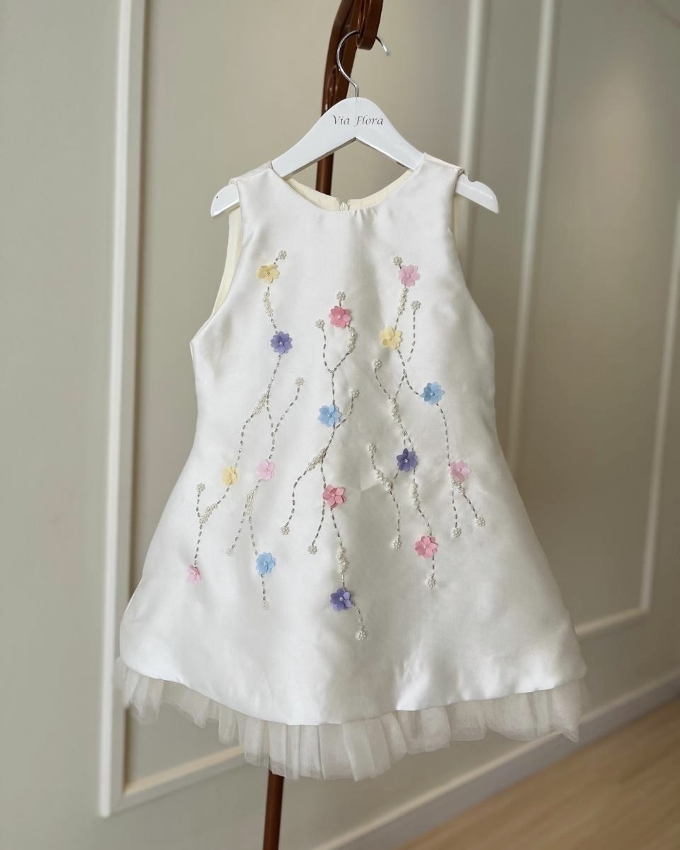 Com modelagem trapézio, que garante conforto e liberdade para as pequenas, ele traz bordados florais coloridos aplicados à mão na barra da peça, adicionando um charme artesanal único.